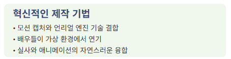 모팩 스튜디오는 최첨단 가상 제작 방식을 활용하여 모션 캡처와 언리얼 엔진 기술을 결합했습니다. 배우들은 가상 환경에서 연기를 펼쳤고, 이를 통해 실시간 조정과 실사와 애니메이션의 자연스러운 융합이 가능해졌습니다. 이러한 접근 방식은 시각적 스토리텔링을 향상시킬 뿐만 아니라, 애니메이션 영화 제작의 새로운 기준을 제시했습니다.