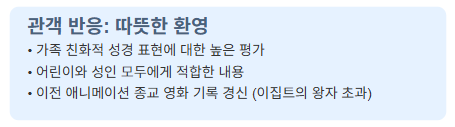영화의 박스 오피스 성적은 이러한 긍정적인 반응을 뒷받침합니다. '더 킹 오브 킹스'는 개봉 첫 주말에 1900만 달러의 수익을 올려, 1998년 '이집트의 왕자'가 세운 애니메이션 종교 영화 기록을 경신했습니다. 이러한 성공은 신앙 기반 애니메이션 콘텐츠에 대한 강력한 수요를 보여줍니다.