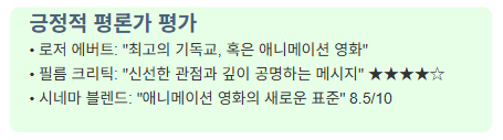 시네마 블렌드: "가상 제작 기술의 혁신적 활용은 애니메이션 영화 제작의 새로운 표준을 제시한다. 특히 예루살렘의 재현과 기적의 장면들은 기술적으로 눈부시다" - 8.5/10