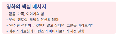 이 영화는 단순히 종교적 메시지를 전달하는 것을 넘어, 가족 간의 유대, 이야기의 힘, 그리고 세대를 초월한 가치 전달이라는 보편적 주제를 탐구함으로써 다양한 관객층에게 호소력 있는 작품으로 평가받고 있습니다.