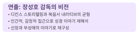 장성호 감독의 연출 스타일은 과감하면서도 존중심이 깃들어 있습니다. 그는 디킨스의 스토리텔링과 복음서 내러티브 사이의 미묘한 균형을 섬세하게 구축합니다. 디킨스가 아들 월터에게 예수의 생애를 들려주는 렌즈를 통해 이야기를 구성한 선택은 영감적입니다. 이는 종종 엄숙한 영역으로 치부되는 성경 영화에 인간적이고 감정적으로 접근 가능한 진입점을 만들어냅니다.