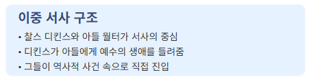 이 영화는 찰스 디킨스와 그의 아들 월터의 시선을 통해 성경 이야기를 독특하게 풀어냅니다. 디킨스가 아들에게 예수의 삶을 들려주는 과정에서, 그들은 역사적 사건 속으로 직접 들어가 예수의 가르침, 기적, 그리고 십자가에 못 박히는 과정을 직접 목격하게 됩니다. 이런 이중 서사 구조는 이야기에 개인적인 감성을 더할 뿐만 아니라, 역사적 사건과 현대 관객 사이의 간극을 효과적으로 좁혀줍니다.