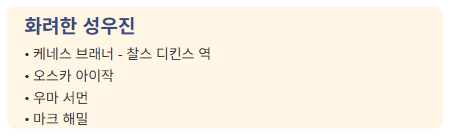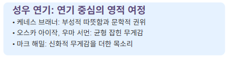 오스카 아이작과 우마 서먼은 균형 잡힌 무게감을 제공하는 반면, 마크 해밀의 참여는 예상치 못한 공명을 더합니다. 그의 목소리는 신화적 무게감을 지니고 있어 영화의 감정적, 영적 질감을 한층 풍부하게 만듭니다.