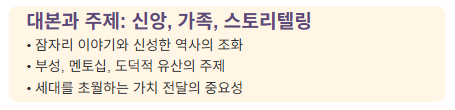 대본과 주제: 신앙, 가족, 스토리텔링