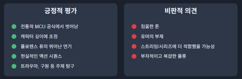 플로렌스 퓨의 옐레나 벨로바 역할이 널리 칭찬받았으며, 많은 사람들이 그녀의 연기가 영화에 감정적 깊이를 더하는 돋보이는 요소라고 언급했습니다. 비평가들은 또한 영화의 현실적인 액션 시퀀스와 트라우마, 구원과 같은 주제 탐구를 강조했습니다.