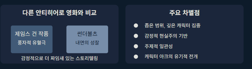 다른 안티히어로 앙상블 영화들과 비교했을 때, '썬더볼츠'는 감정적으로 더 짜임새 있고 주제적으로 일관성이 있습니다. 제임스 건의 풍자적 유혈극과 달리, 슈라이어의 버전은 내면의 성찰에 의존하며, 각 캐릭터의 아크를 감정적 현실주의에 근거하게 합니다.