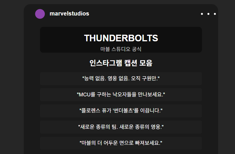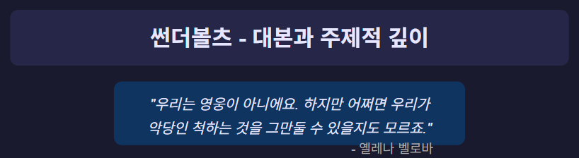 "우리는 영웅이 아니에요. 하지만 어쩌면 우리가 악당인 척하는 것을 그만둘 수 있을지도 모르죠."라는 옐레나의 대사는 '썬더볼츠'의 핵심 주제를 반영합니다—선과 악 사이의 공간은 대부분의 사람들이 살아가는 곳입니다.