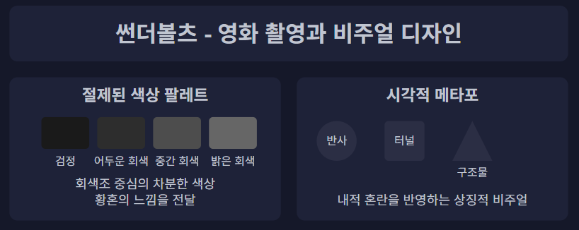'썬더볼츠'의 비주얼은 절제되어 있으며, 회색조의 색상이 대부분의 팔레트를 지배합니다. 이 차분한 미학은 지속적인 황혼의 느낌—도덕성과 광기 사이의 경계 지대를 만들어냅니다.