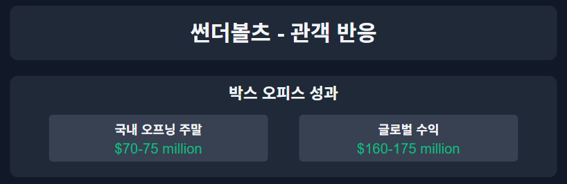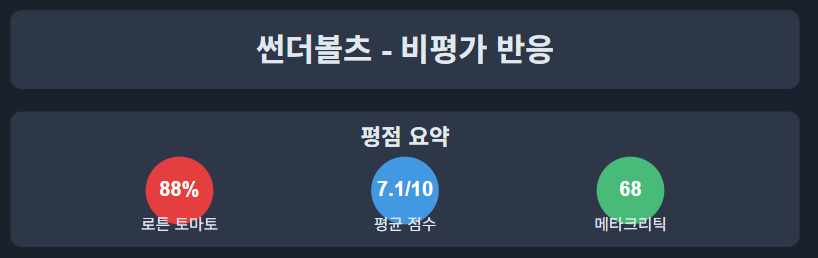 '썬더볼츠'는 마블 시네마틱 유니버스(MCU)의 주목할 만한 신작으로서 비평가와 관객 모두에게 상당한 관심을 받았습니다. 이 영화에 대한 반응은 캐릭터 중심의 내러티브에 대한 감사와 톤 선택에 대한 비평이 혼합되어 있습니다.