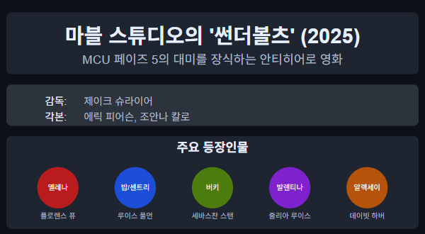 마블 시네마틱 유니버스(MCU) 페이즈 5의 대미를 장식하는 '썬더볼츠'는 전통적인 슈퍼히어로 영화와는 다른 매력을 선보입니다. 제이크 슈라이어 감독과 에릭 피어슨, 조안나 칼로 각본가가 함께한 이 작품은 과거와 씨름하는 안티히어로들이 모여 다가오는 위협에 맞서는 이야기를 그립니다.