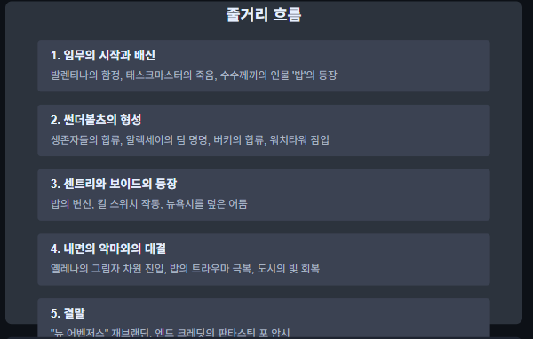 드 폰테인의 배신을 깨달은 생존자들은 알렉세이 쇼스타코프와 합류하고, 그가 이들을 "썬더볼츠"라고 명명합니다. 그들의 여정은 버키 반스에게로 이어지며, 버키는 밥이 드 폰테인의 실험 대상이었다는 과거를 알게 된 후 그들의 대의에 합류합니다. 함께 그들은 이제 "워치타워"가 된 옛 어벤저스 타워에 잠입합니다.