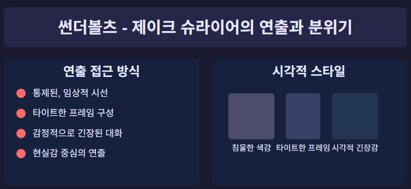 슈라이어 감독은 '썬더볼츠'를 통제된, 거의 임상적이라 할 만한 시선으로 접근합니다. 그는 전형적인 마블 영화의 화려한 허세를 벗겨내고, 그 자리에 침울한 분위기, 타이트한 프레임, 감정적으로 긴장된 대화를 담아냅니다. 일부 시퀀스는 좀 더 역동적인 연출을 기대했을 수도 있지만, 이는 명백히 의도적인 선택으로 보입니다. 슈라이어는 현실감에 중점을 두어, 더 화려한 마블 영화 팬들에게는 실망스러울 수 있으나 이 또한 분명한 의도였습니다.
