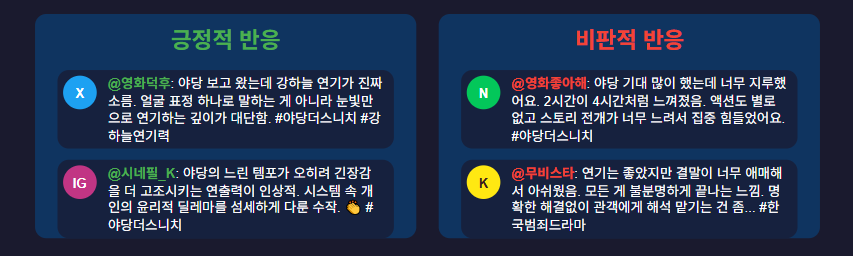 소셜 미디어 플랫폼에서는 "야당: 더 스니치"에 관한 토론이 활발히 이루어졌습니다. #야당더스니치, #한국범죄드라마와 같은 해시태그가 트렌드를 이루며 시청자들이 의견을 공유했습니다. 일부 사용자들은 영화의 생각을 자극하는 주제와 강력한 연기를 칭찬한 반면, 다른 이들은 페이스와 내러티브 구조에 대해 토론했습니다.