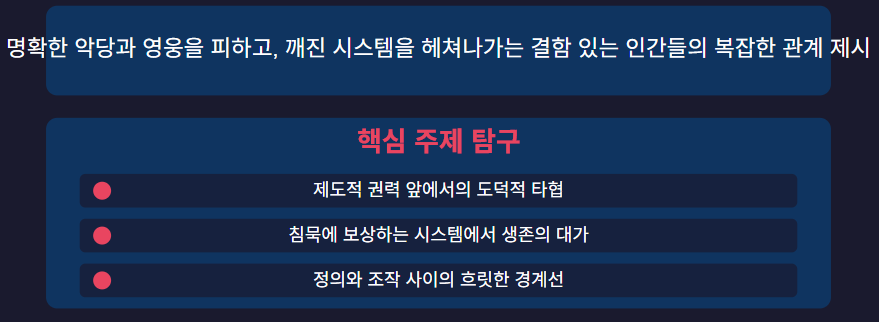 영화의 핵심 주제 중 하나는 정의와 부패 사이의 얇은 경계선입니다. 법 집행이라는 명목 하에 구관희 검사는 개인적 이득을 위해 시스템을 조작합니다. 그와 강수의 관계는 권력이 어떻게 부패할 수 있는지, 보호자를 가해자로 변모시키는 과정을 보여줍니다.