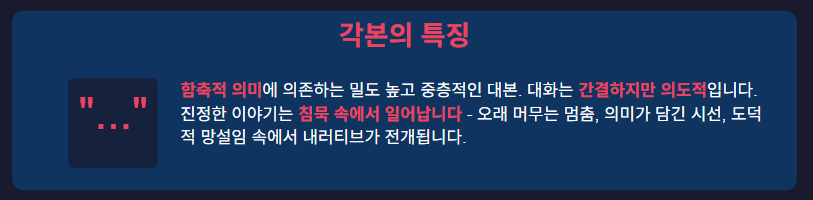 최진영 각본가는 함축적 의미에 크게 의존하는 밀도 높고 중층적인 대본을 썼습니다. 대화는 간결하지만 의도적입니다. 진정한 이야기는 침묵 속에서 일어납니다 - 오래 머무는 멈춤, 의미가 담긴 시선, 도덕적 망설임. 이 각본은 명확한 악당과 영웅을 피하고, 대신 깨진 시스템을 헤쳐나가는 결함 있는 인간들의 복잡한 관계를 제시합니다.