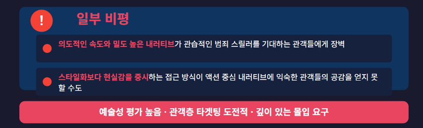 다만 일부 평론가들은 영화의 의도적인 속도와 밀도 높은 내러티브가 더 관습적인 범죄 스릴러를 기대하는 관객들에게는 잠재적 장벽이 될 수 있다고 지적했습니다. 스타일화보다 현실감을 중시하는 영화의 접근 방식이 액션 중심의 내러티브에 익숙한 모든 관객들에게 공감을 얻지 못할 수도 있다는 의견이 있었습니다.