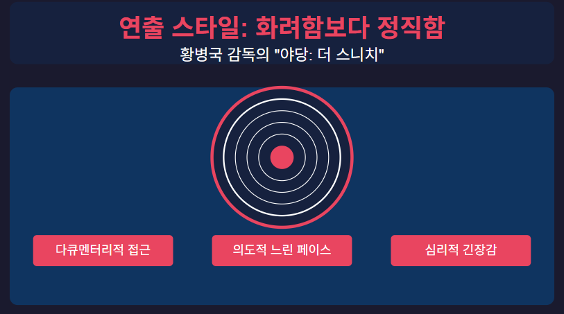 황병국 감독의 작품 세계에서, 이 영화는 스타일의 성숙을 보여줍니다. 그의 초기 프로젝트들이 장르 관습에 기대었다면, "야당"은 그것들을 벗겨내고 감정적, 지적 몰입을 요구하는 캐릭터 중심의 천천히 타오르는 작품을 제공합니다.
