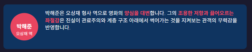 박해준은 오상재 형사 역으로 영화의 양심을 대변합니다. 그의 조용한 저항과 끓어오르는 좌절감은 진실이 관료주의와 계층 구조 아래에서 썩어가는 것을 지켜보는 관객의 무력감을 반영합니다.