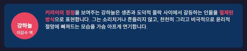 강하늘은 이강수 역할로 커리어의 정점을 보여줍니다. 생존과 도덕적 몰락 사이에서 갈등하는 인물을 절제된 방식으로 표현해 가슴 아픈 연기를 선보입니다. 그는 소리치거나 흔들리지 않고 - 천천히, 그리고 비극적으로 윤리적 절망에 빠져듭니다.