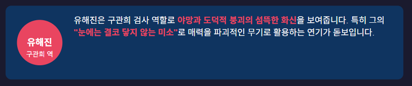 유해진은 구관희 검사 역할로 야망과 도덕적 붕괴의 섬뜩한 화신을 보여줍니다. 눈에는 결코 닿지 않는 미소로, 유해진은 매력을 파괴적인 무기로 활용합니다.
